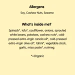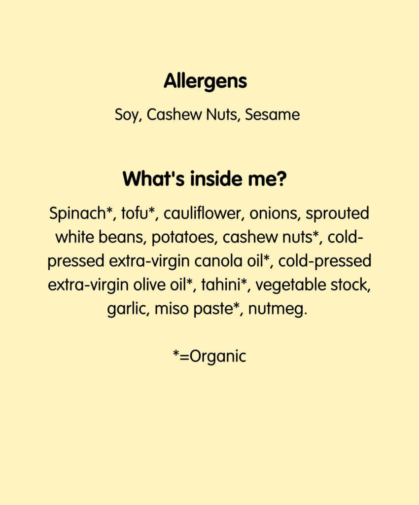 Spinach*, tofu*, cauliflower, onions, sprouted white beans, potatoes, cashew nuts*, cold-pressed extra-virgin canola oil*, cold-pressed extra-virgin olive oil*, tahini*, vegetable stock, garlic, miso paste*, nutmeg. *=Organic
